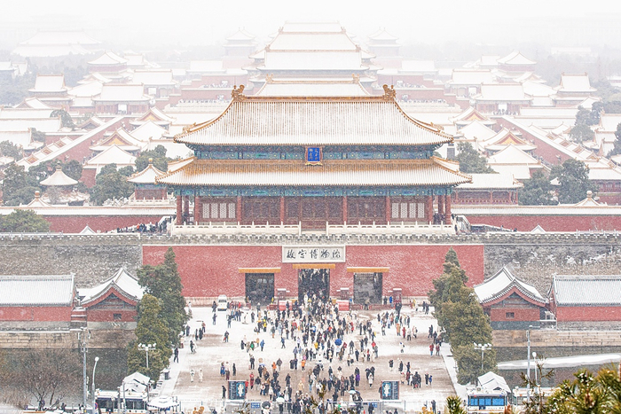 12日,北京迎来2025年冬季初雪,俯瞰雪中故宫。