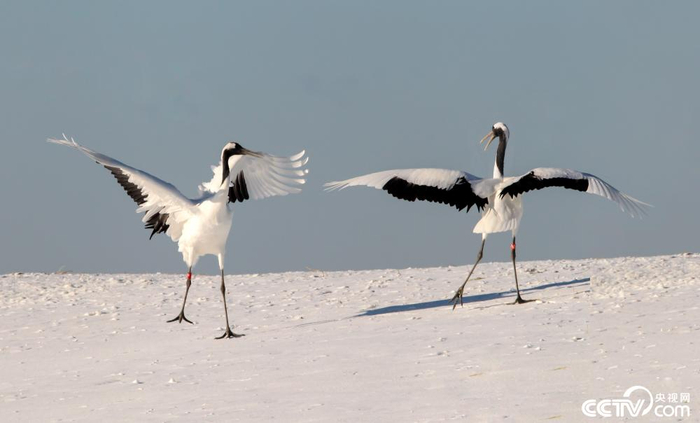 黑龙江齐齐哈尔:丹顶鹤雪中起舞仙气十足。
