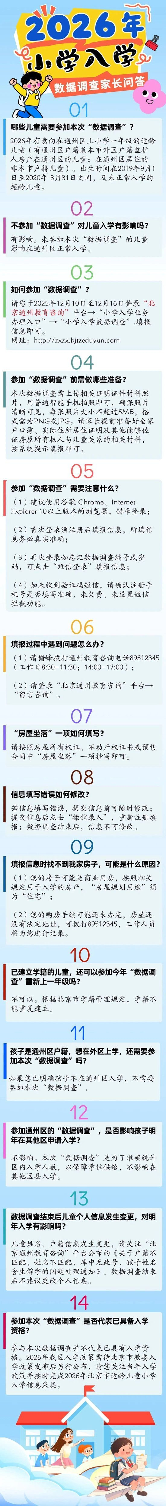 若在填报过程中遇到问题,可查看《2026年小学入学数据调查家长问答》。也可拨打通州教育咨询电话89512345(工作日8:30-11:30;14:00-17:00)。